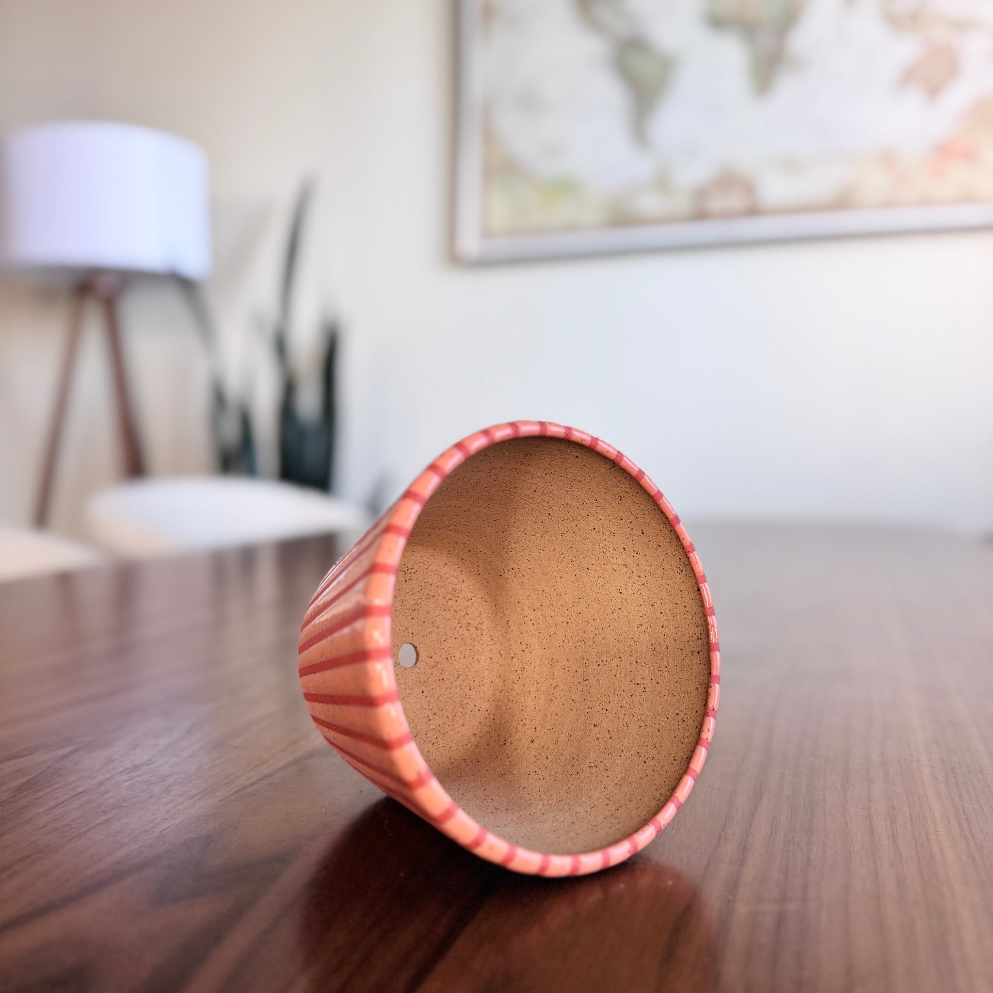 Made of speckled stoneware clay and glaze. There is one drainage hole in the bottom of the pot.